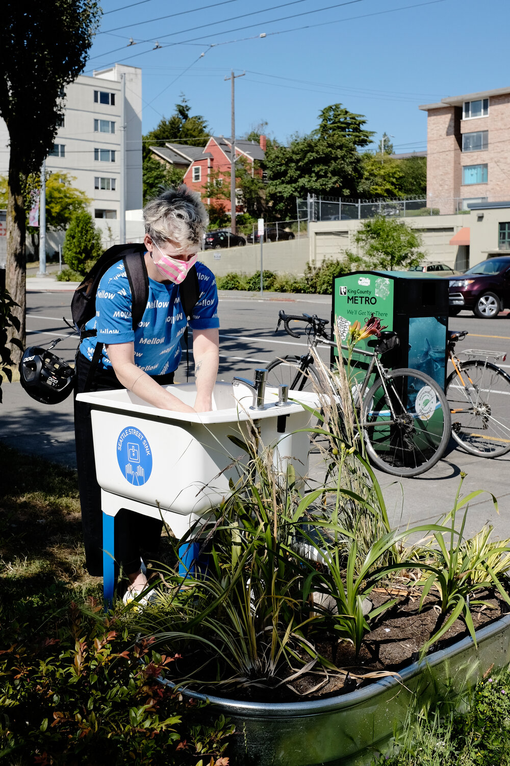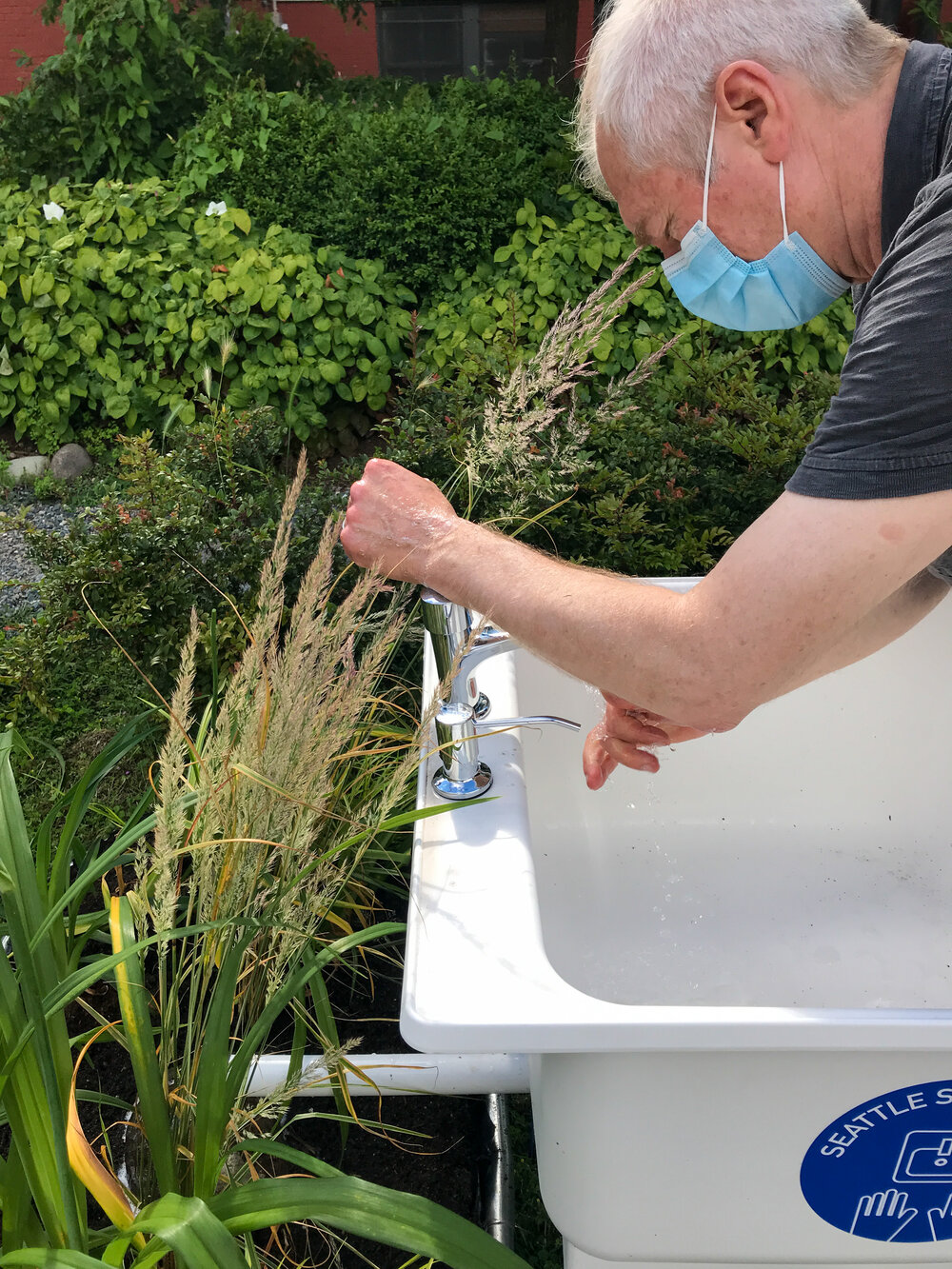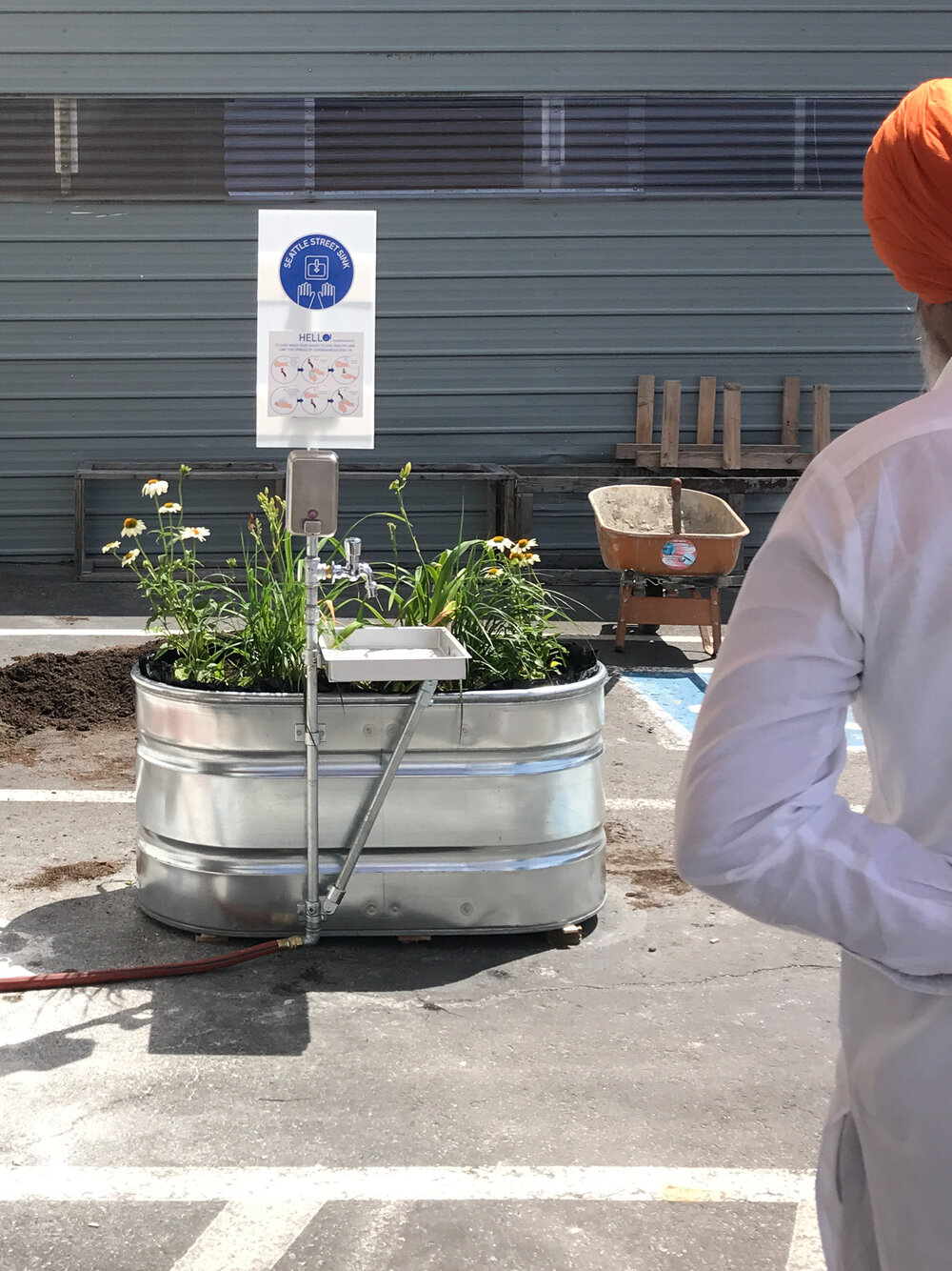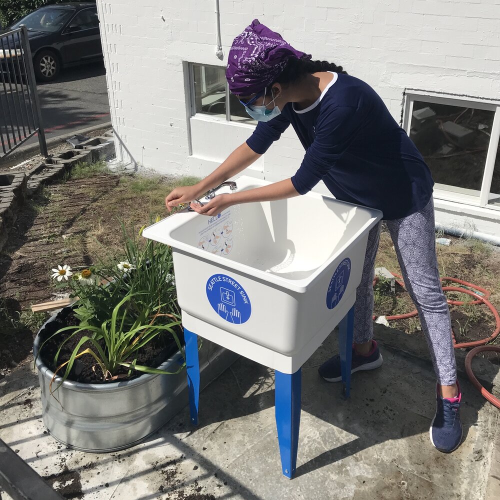 The Seattle Street Sink makes hand washing easy and accessible for anyone, anywhere The Seattle Street Sink is a do-it-yourself solution that provides a publicly accessible place for people to wash their hands. The sinks are made from off-the-shelf parts that connect to a hose bib on public or private property. Water from the sink drains to a trough filled with soil and water loving plants a combination hand washing station and rain garden!